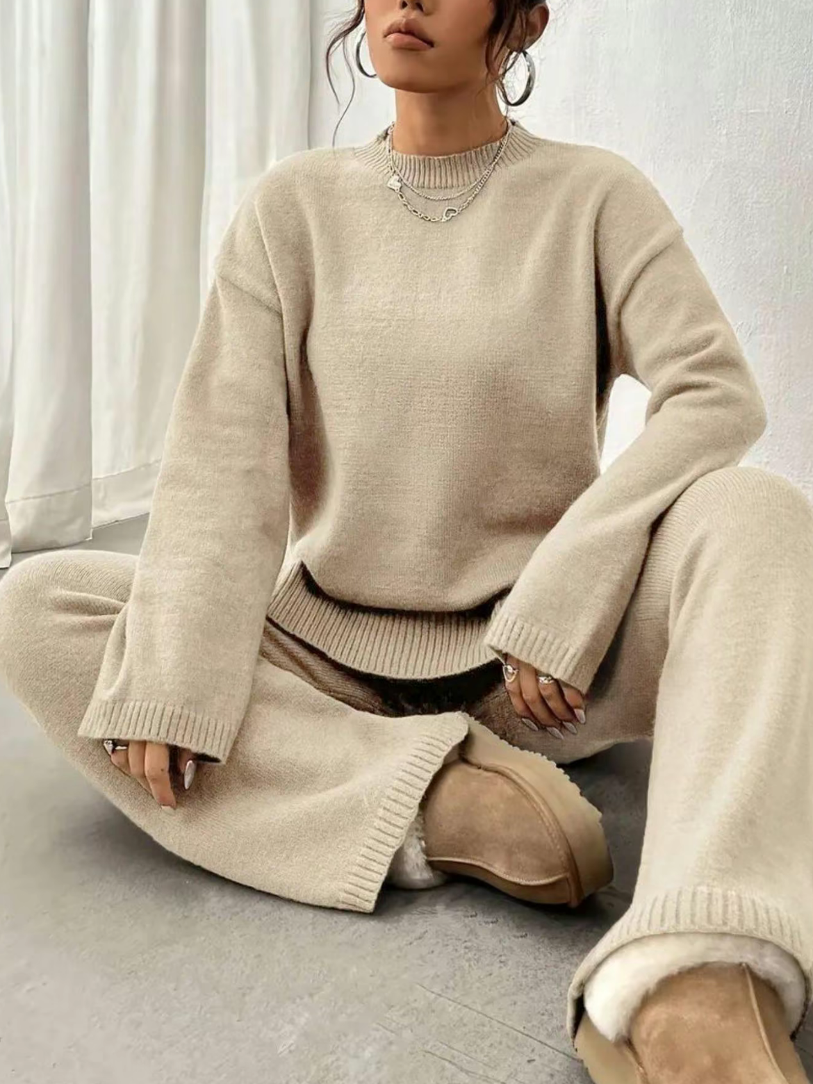 Women's Solid Drop Shoulder Split Hem Sweater & Elastic Waist Straight Leg Pants Two-piece Set